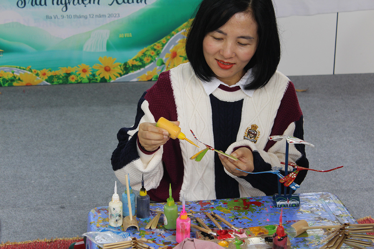 Du khách trải nghiệm tự làm chuồn chuồn bằng tre (Ảnh: TITC)