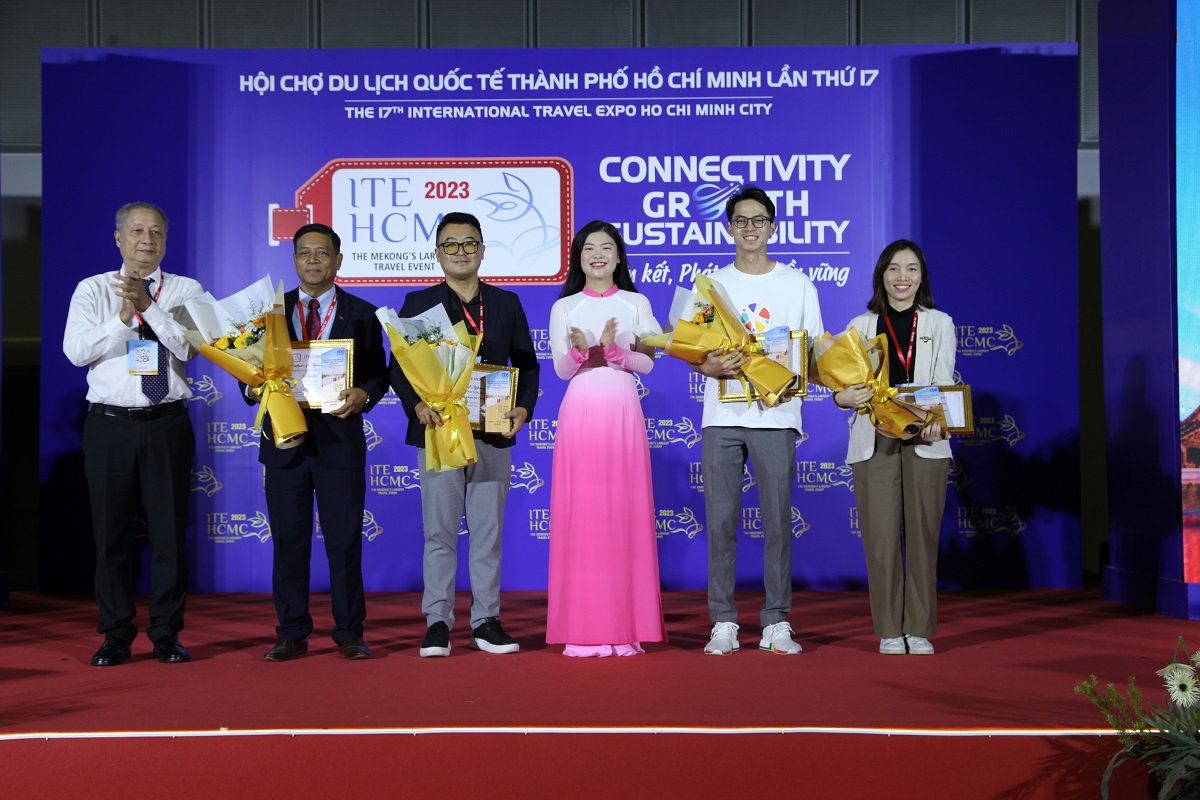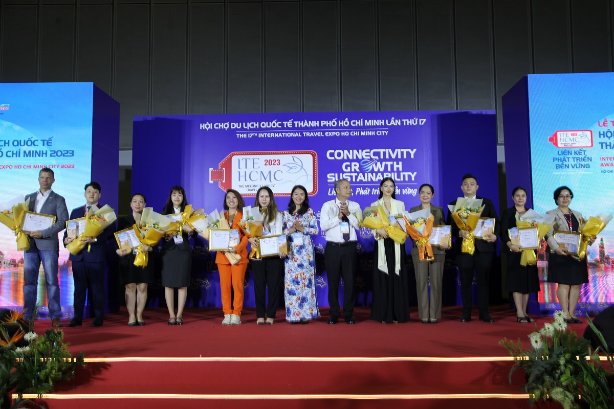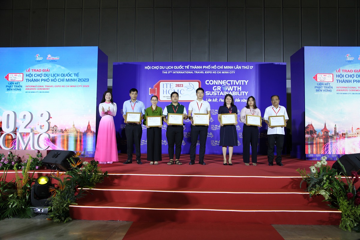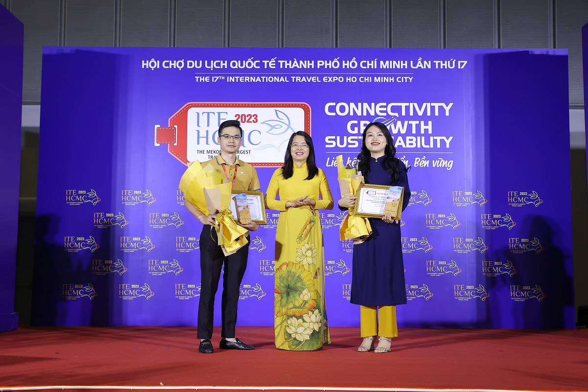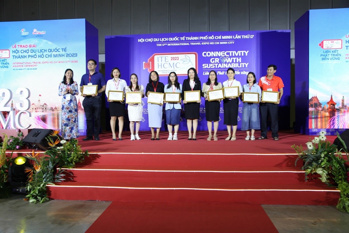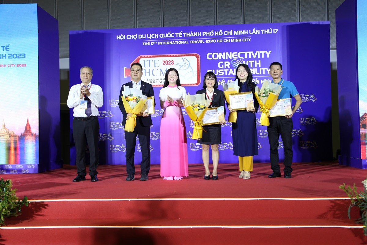 Giám đốc Trung tâm Xúc tiến Du lịch TP. HCM Nguyễn Cẩm Tú trao giấy chứng nhận và hoa cho các đơn vị đạt giải Thiết kế gian hàng đẹp hạng mục Gian hàng thu hút nhất. Ảnh: TITC