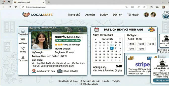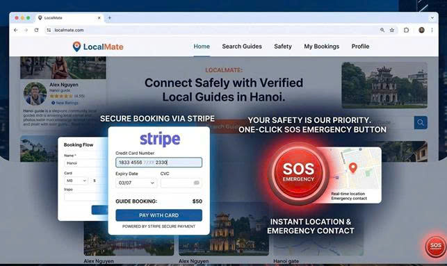 Mô phỏng hồ sơ buddy; cổng thanh toán quốc tế Stripe và cơ chế bảo vệ khách hàng SOS