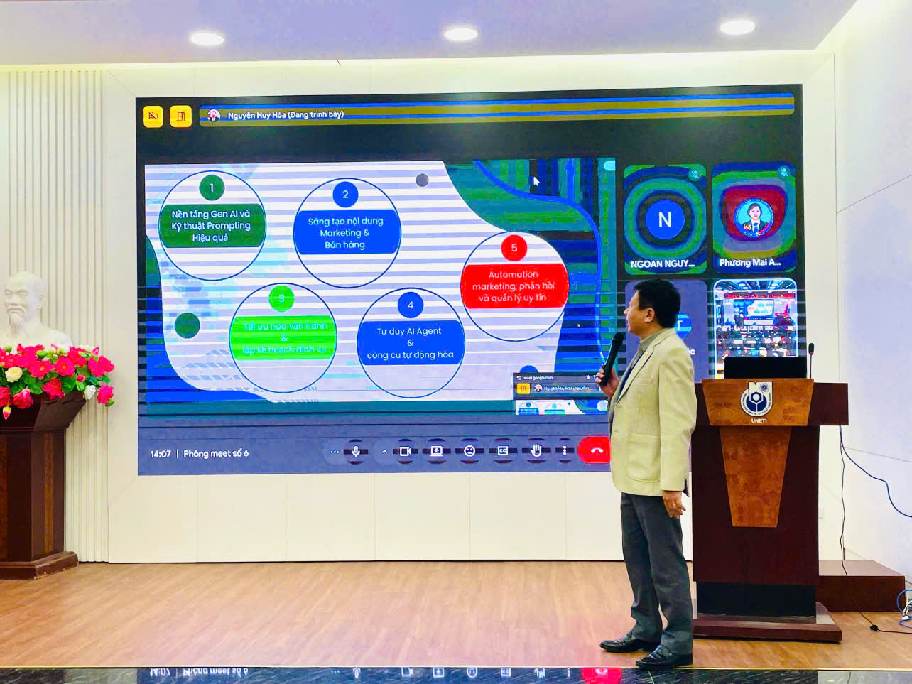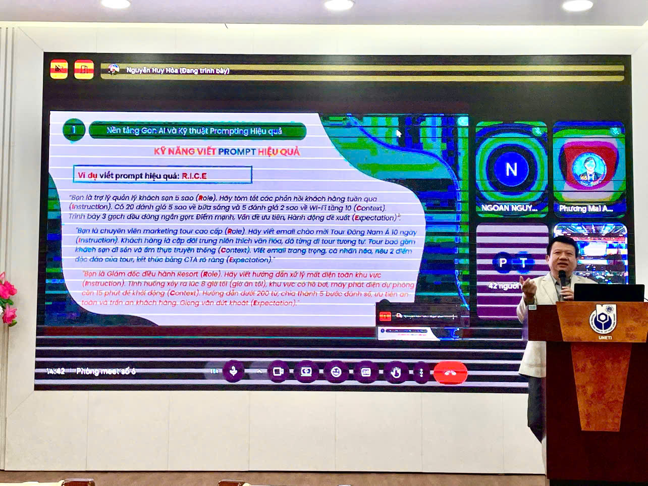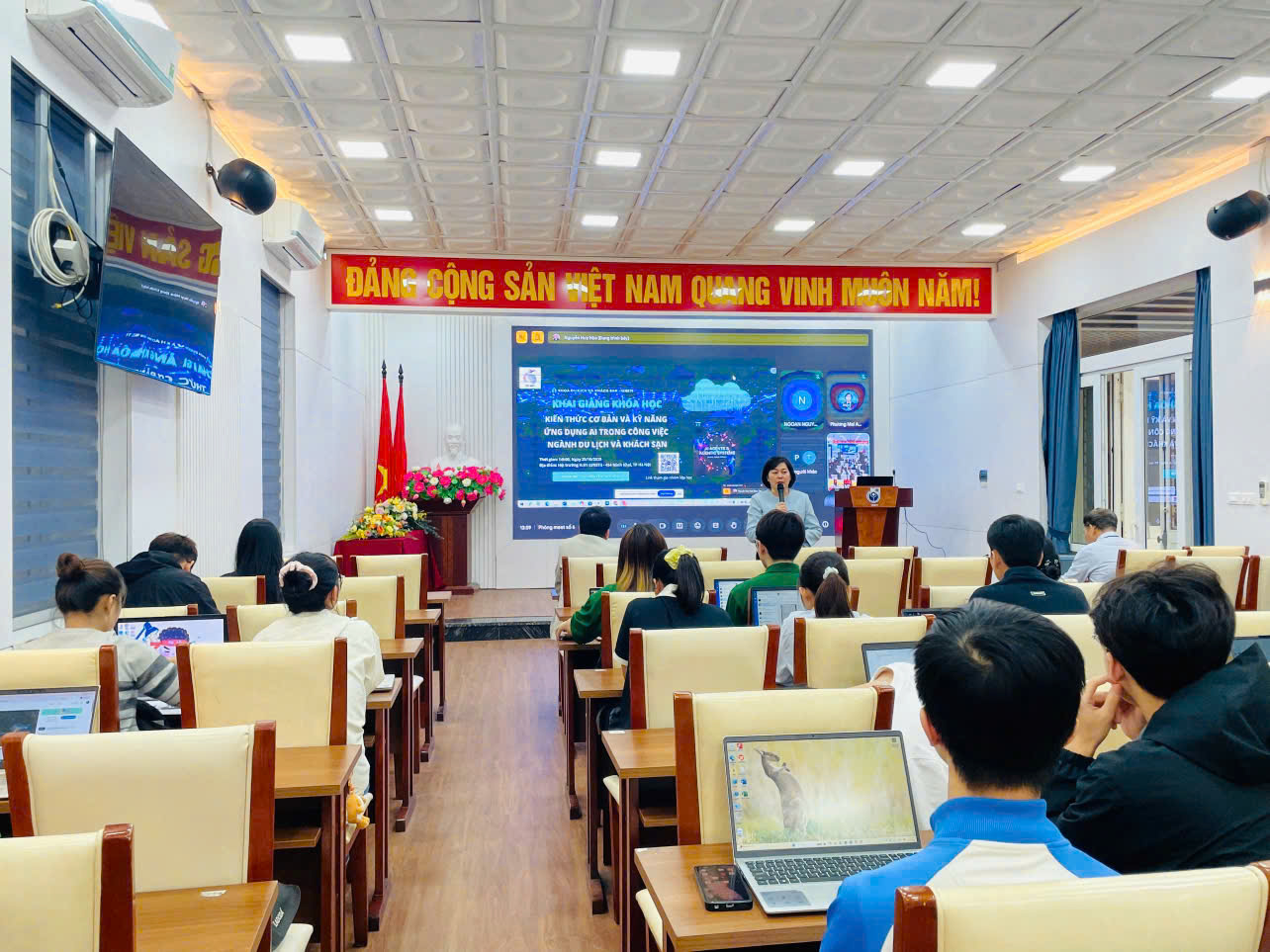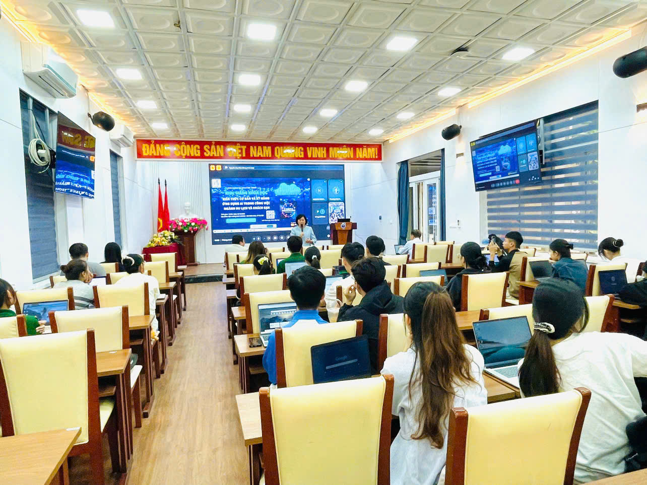Buổi tập huấn không chỉ là một buổi học lý thuyết, mà là trải nghiệm thực hành trực tiếp với các công cụ Gen AI hiện đại. Sinh viên được hướng dẫn cách sử dụng AI để giải quyết các bài toán thực tế trong ngành Du lịch - Khách sạn, từ quản lý dữ liệu khách hàng đến xây dựng chiến lược truyền thông.